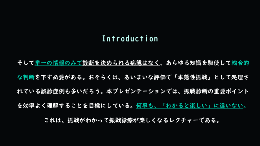 #5. Introduction そして単一の情報のみで診断を決められる病態はなく、あらゆる知識を駆使して総合的な判断を下す必要がある。おそらくは、あいまいな評価で「本態性振戦」として処理されている誤診症例も多いだろう。本プレゼンテーションでは、振戦診断の重要ポイントを効率よく理解することを目標にしている。何事も、「わかると楽しい」に違いない。これは、振戦がわかって振戦診療が楽しくなるレクチャーである。