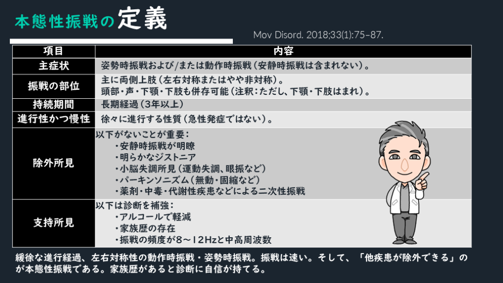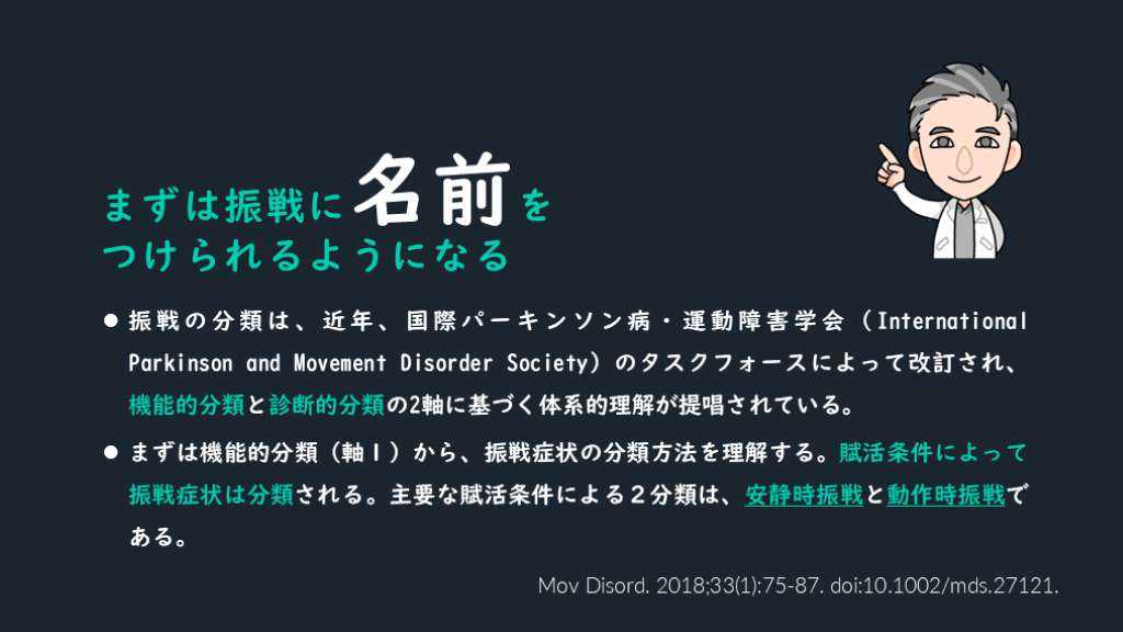 つけられるようになる 振戦の分類は、近年、国際パーキンソン病・運動障害学会(International Parkinson and Movement Disorder Society)のタスクフォースによって改訂され、機能的分類と診断的分類の2軸に基づく体系的理解が提唱されている。