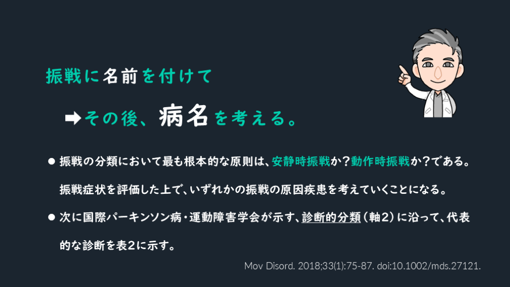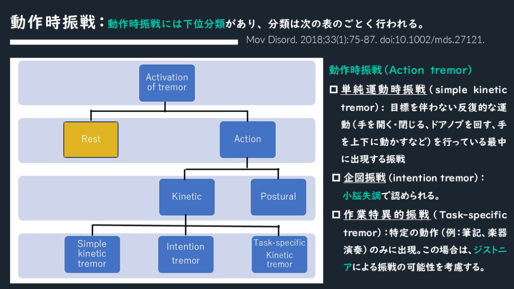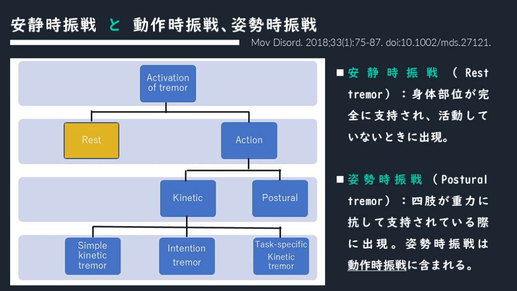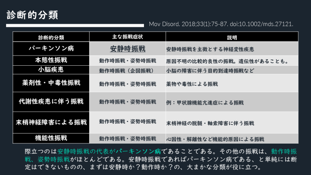 #12. 診断的分類 際立つのは安静時振戦の代表がパーキンソン病であることである。その他の振戦は、動作時振戦、姿勢時振戦がほとんどである。安静時振戦であればパーキンソン病である、と単純には断定はできないものの、まずは安静時か?動作時か?の、大まかな分類が役に立つ。 Mov Disord. 2018;33(1):75-87. doi:10.1002/mds.27121.