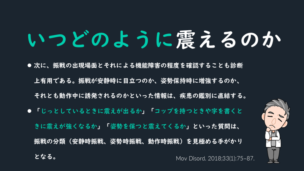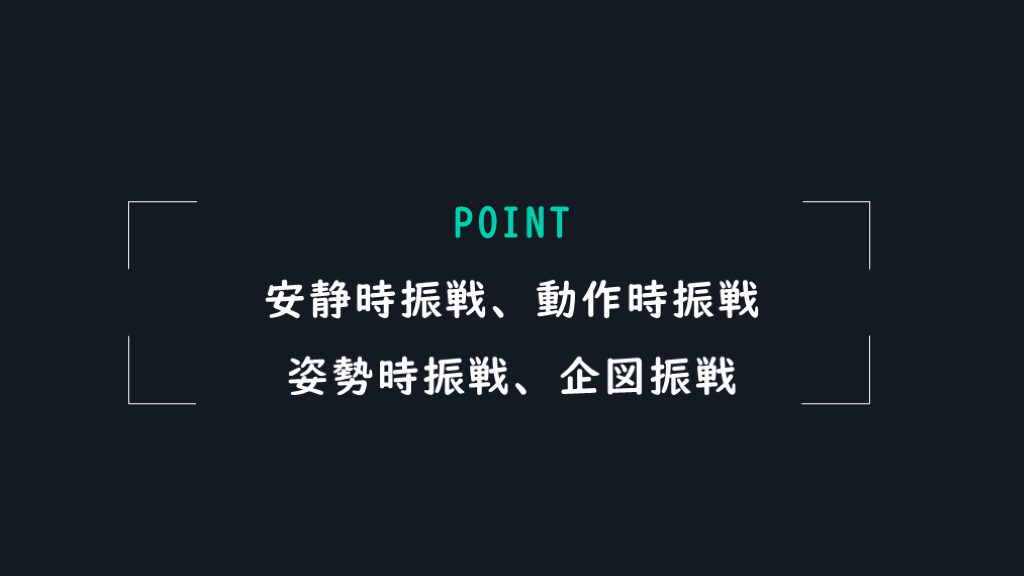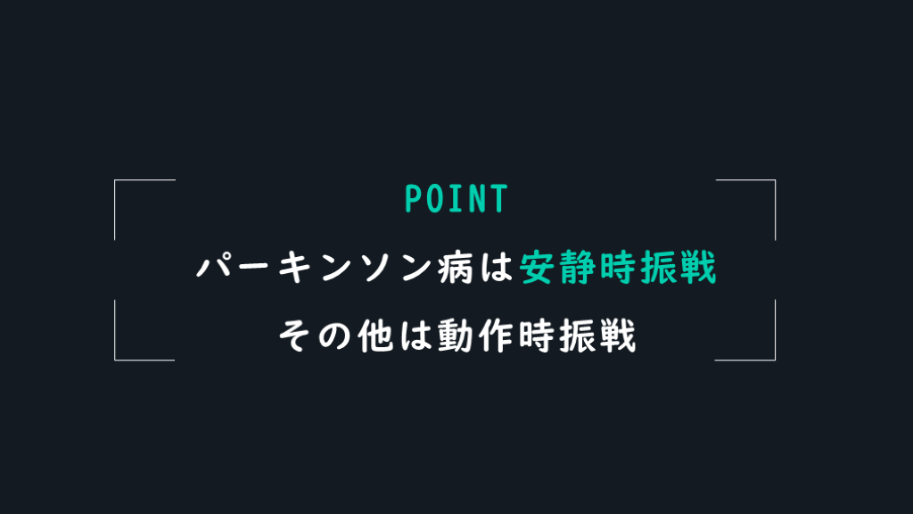 ➡その後、病名を考える。 振戦の分類において最も根本的な原則は、安静時振戦か?動作時振戦か?である。振戦症状を評価した上で、いずれかの振戦の原因疾患を考えていくことになる。