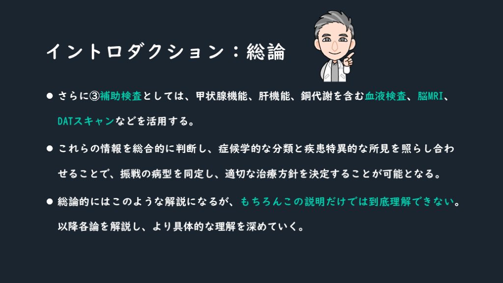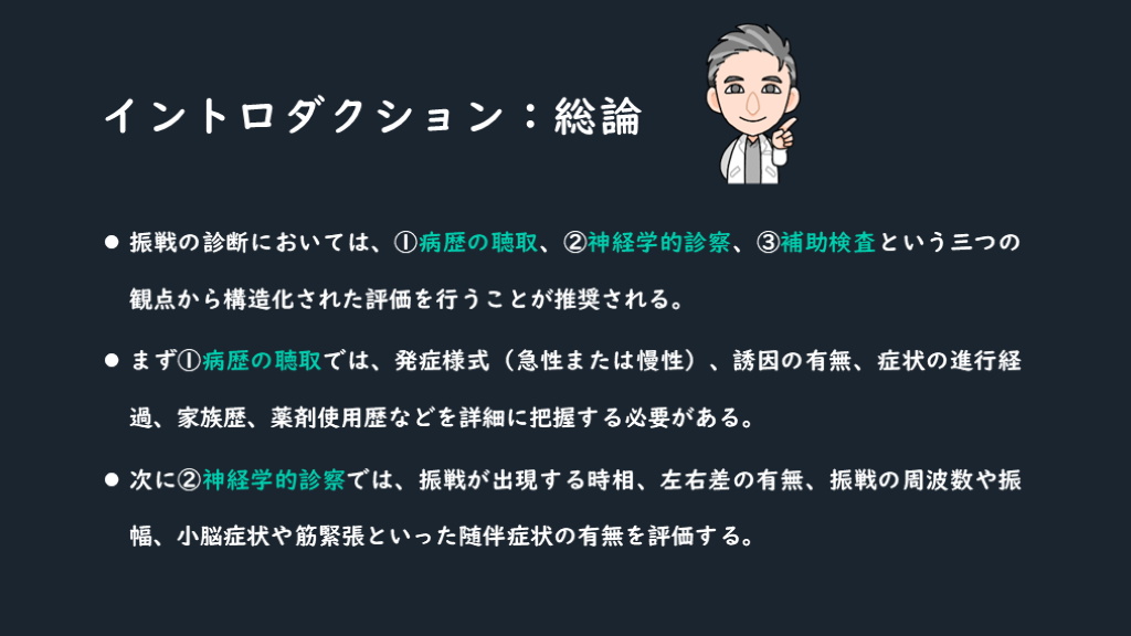 #14. イントロダクション:総論 振戦の診断においては、①病歴の聴取、②神経学的診察、③補助検査という三つの観点から構造化された評価を行うことが推奨される。