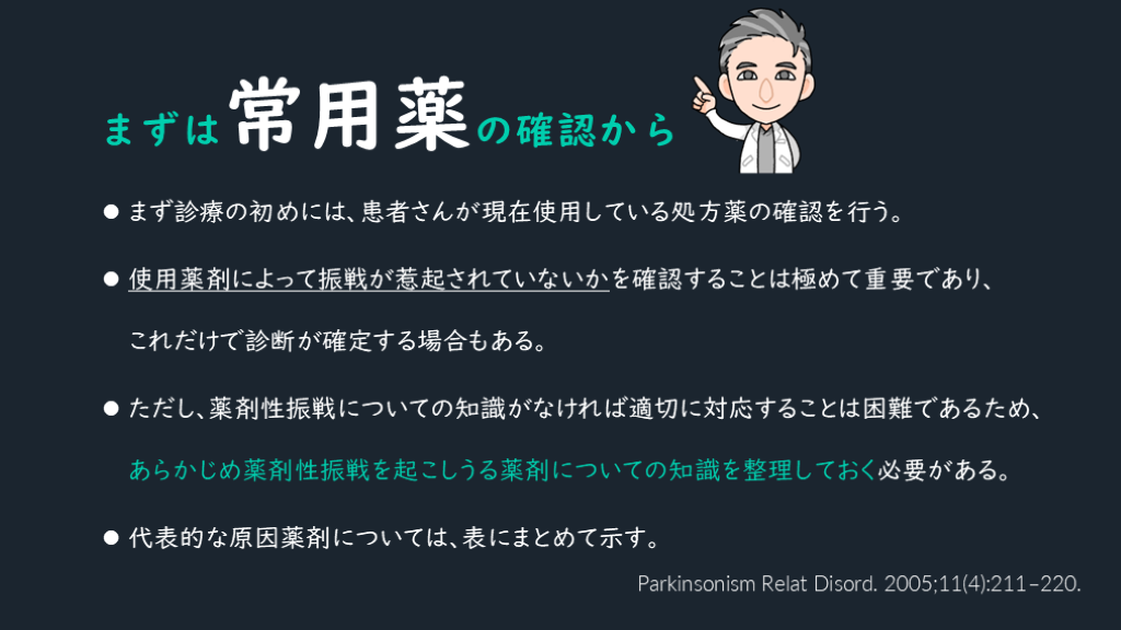 使用薬剤によって振戦が惹起されていないかを確認することは極めて重要であり、 これだけで診断が確定する場合もある。