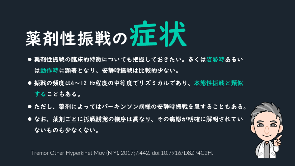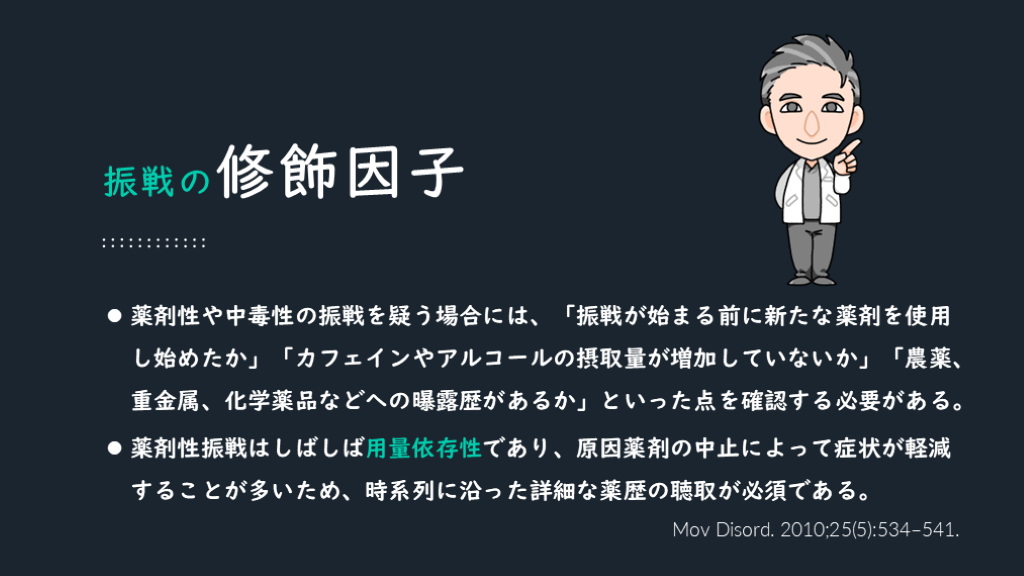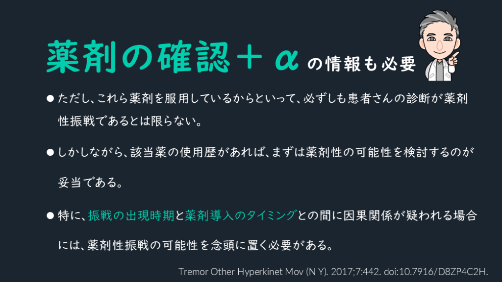 特に、振戦の出現時期と薬剤導入のタイミングとの間に因果関係が疑われる場合には、薬剤性振戦の可能性を念頭に置く必要がある。 Tremor Other Hyperkinet Mov (N Y). 2017;7:442. doi:10.7916/D8ZP4C2H.