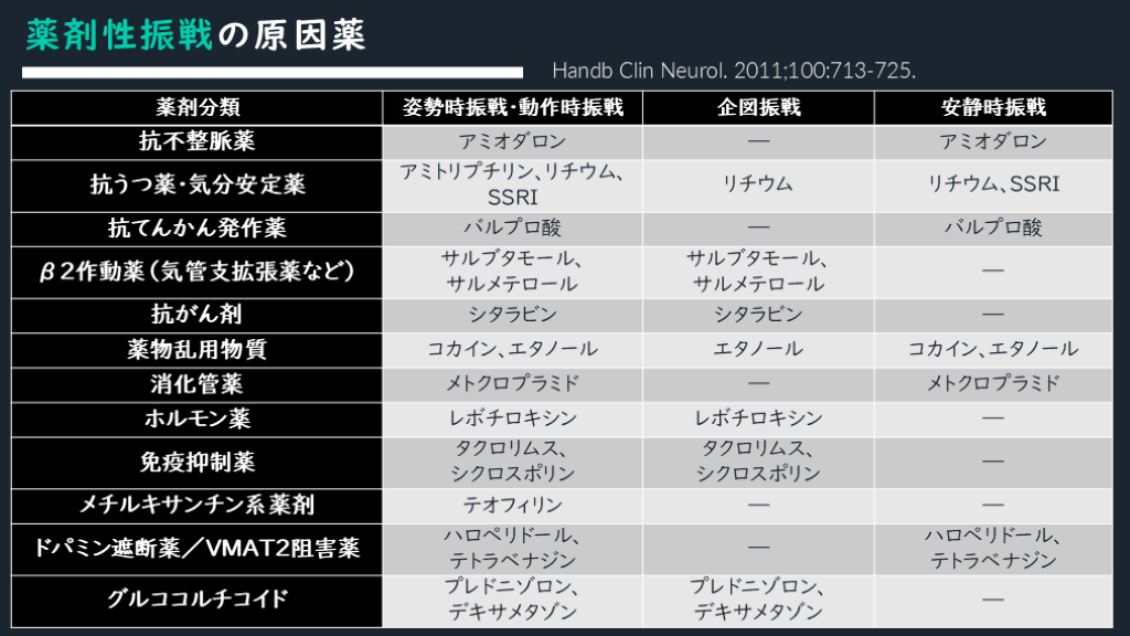 そのほか、β刺激薬などの気管支拡張薬、カルバマゼピンやフェニトインなどの抗てんかん発作薬、ハロペリドールなどの抗精神病薬、カフェインやテオフィリンといった中枢刺激薬も振戦を惹起し得る。 薬剤性振戦の代表的薬剤 Handb Clin Neurol. 2011;100:713-725. doi:10.1016/B978-0-444-52014-2.00051-1.