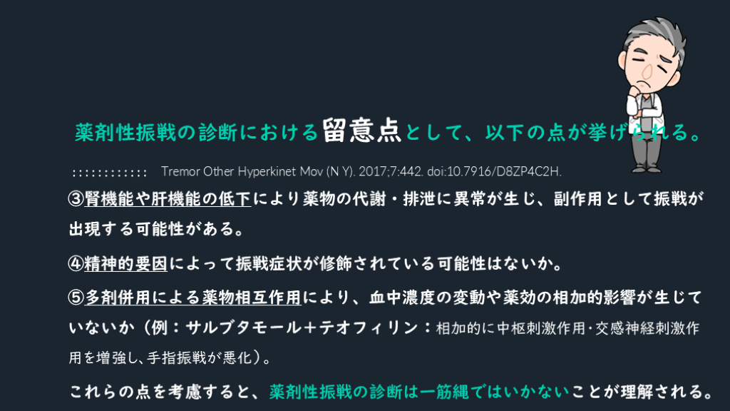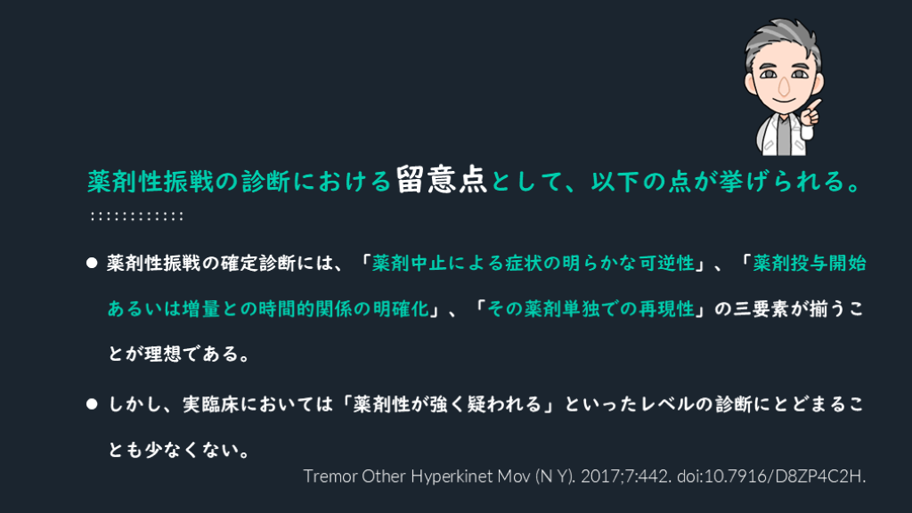 これらの点を考慮すると、薬剤性振戦の診断は一筋縄ではいかないことが理解される。 薬剤性振戦の診断における留意点として、以下の点が挙げられる。 Tremor Other Hyperkinet Mov (N Y). 2017;7:442. doi:10.7916/D8ZP4C2H.