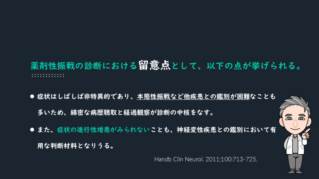また、症状の進行性増悪がみられないことも、神経変性疾患との鑑別において有用な判断材料となりうる。 薬剤性振戦の診断における留意点として、以下の点が挙げられる。 Handb Clin Neurol. 2011;100:713-725.