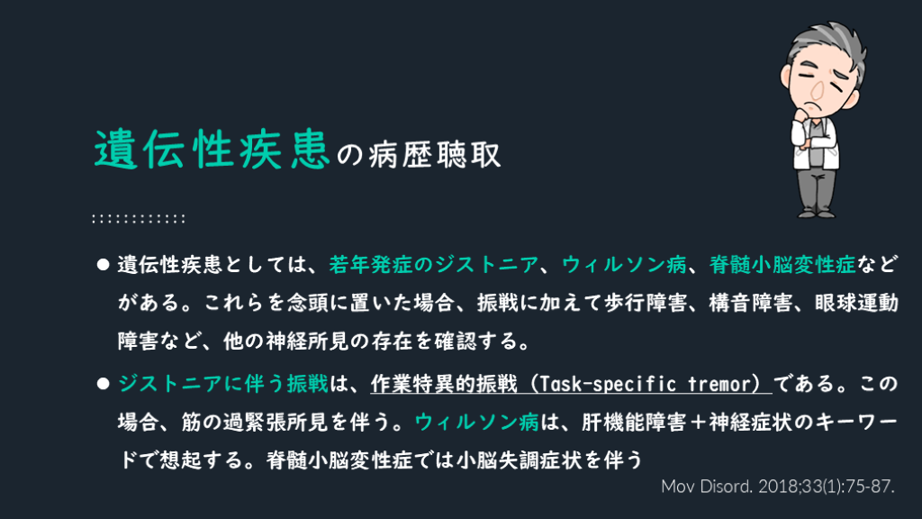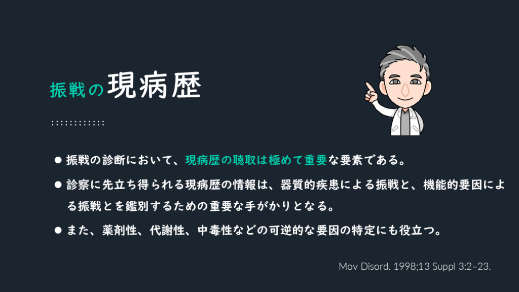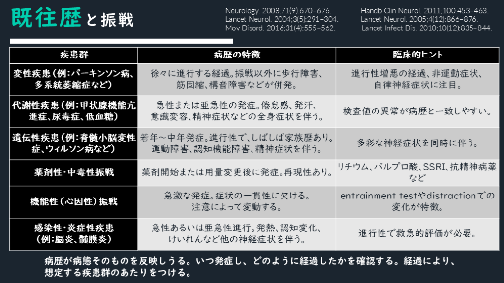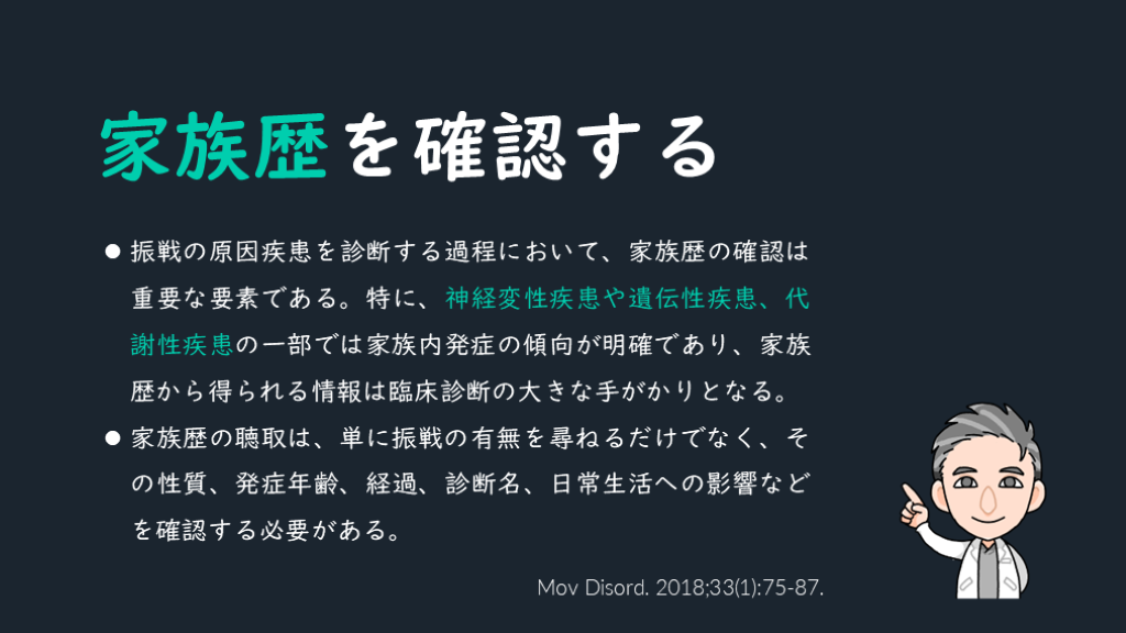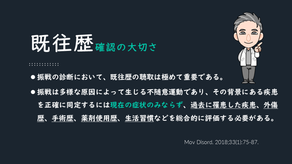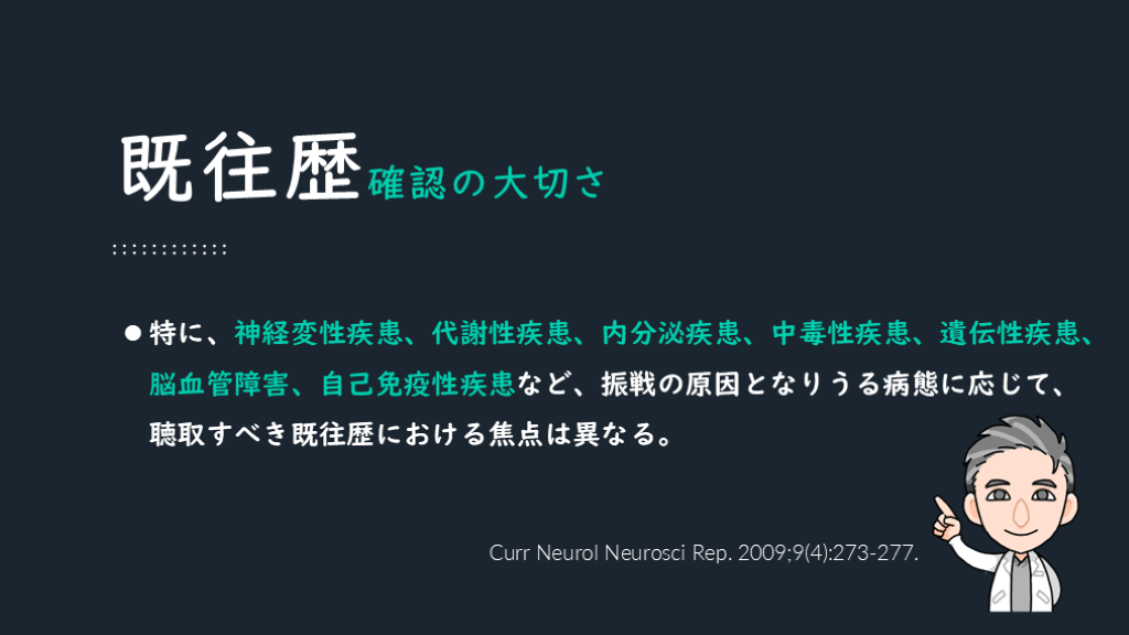 #30. 既往歴確認の大切さ 特に、神経変性疾患、代謝性疾患、内分泌疾患、中毒性疾患、遺伝性疾患、脳血管障害、自己免疫性疾患など、振戦の原因となりうる病態に応じて、聴取すべき既往歴における焦点は異なる。 Curr Neurol Neurosci Rep. 2009;9(4):273-277.