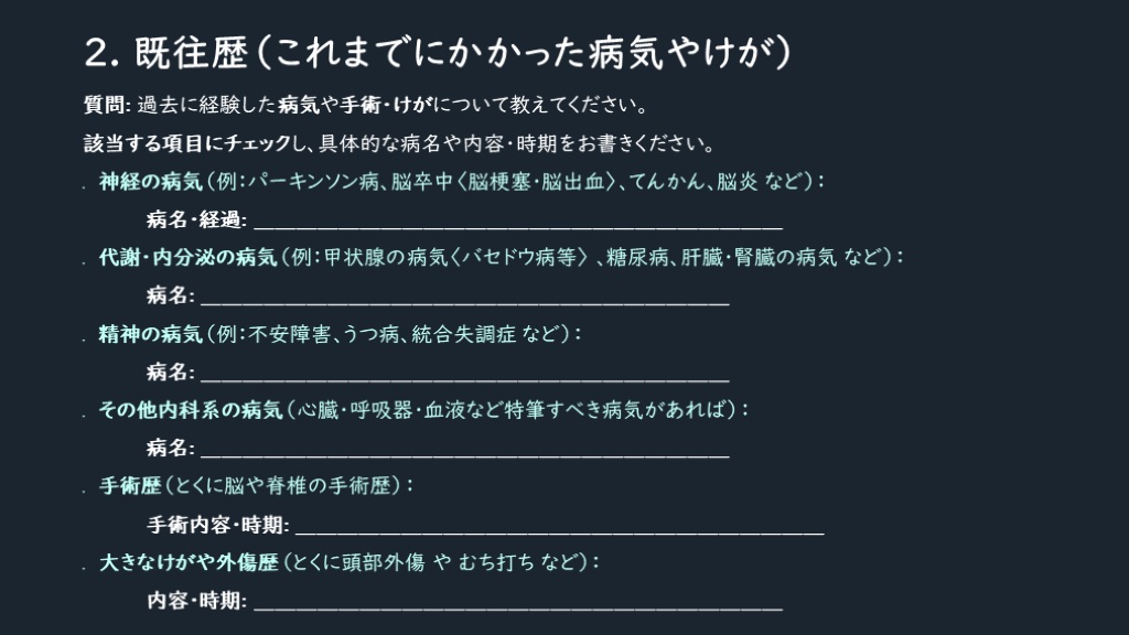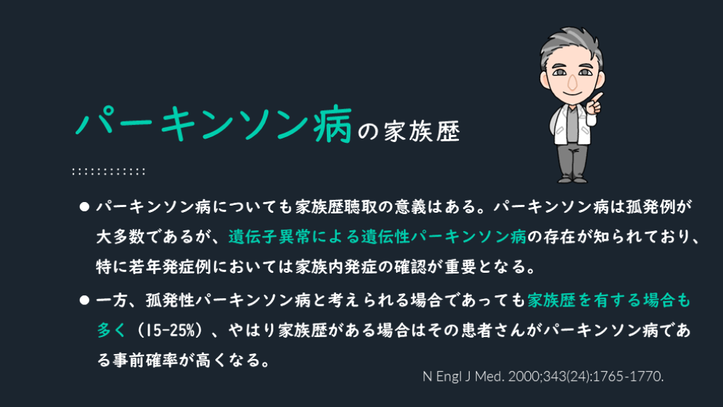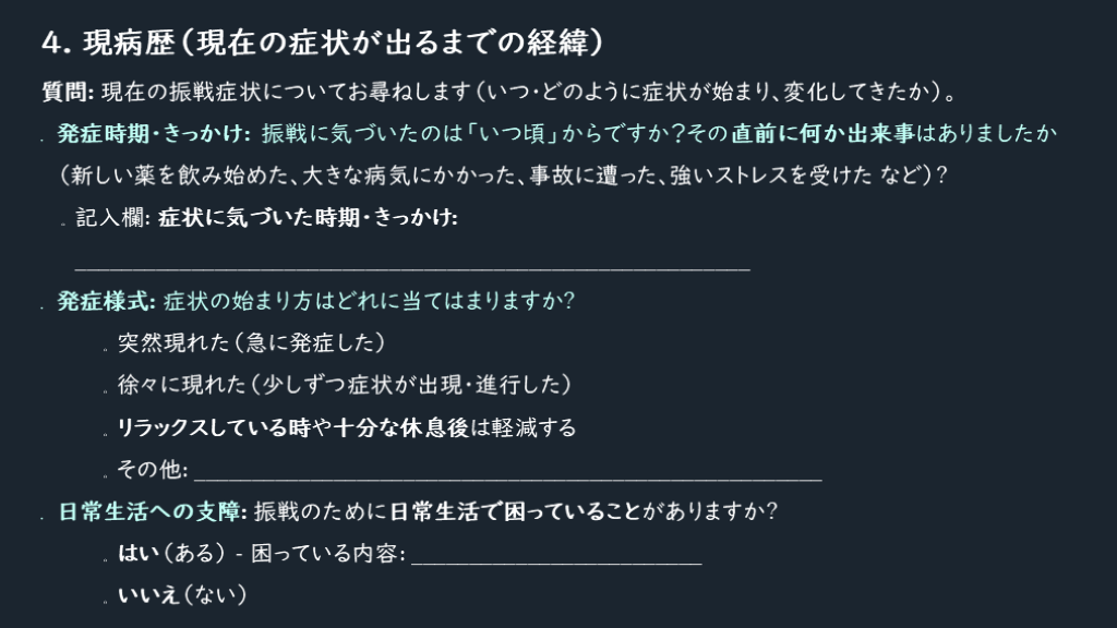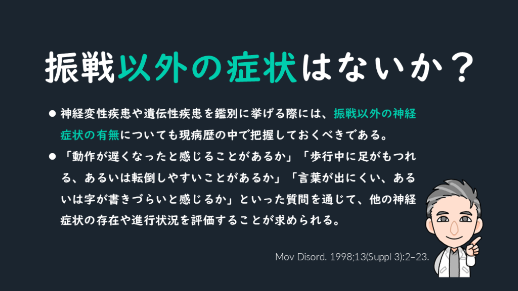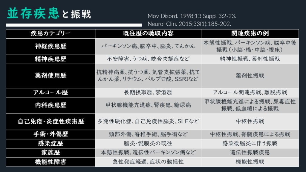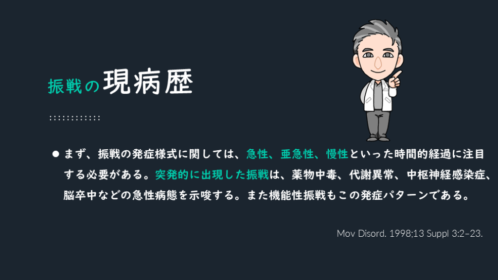 #30. 既往歴確認の大切さ 特に、神経変性疾患、代謝性疾患、内分泌疾患、中毒性疾患、遺伝性疾患、脳血管障害、自己免疫性疾患など、振戦の原因となりうる病態に応じて、聴取すべき既往歴における焦点は異なる。 Curr Neurol Neurosci Rep. 2009;9(4):273-277.