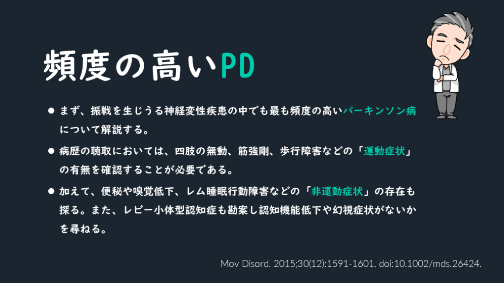 #31. まず、振戦を生じうる神経変性疾患の中でも最も頻度の高いパーキンソン病について解説する。