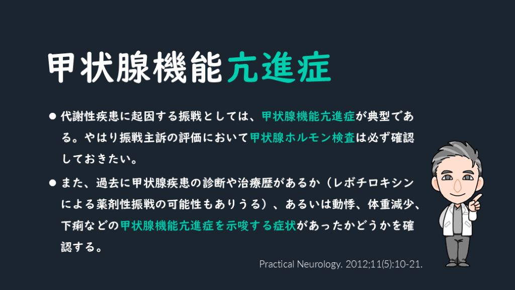 また、過去に甲状腺疾患の診断や治療歴があるか(レボチロキシンによる薬剤性振戦の可能性もありうる)、あるいは動悸、体重減少、下痢などの甲状腺機能亢進症を示唆する症状があったかどうかを確認する。 甲状腺機能亢進症 Practical Neurology. 2012;11(5):10-21.