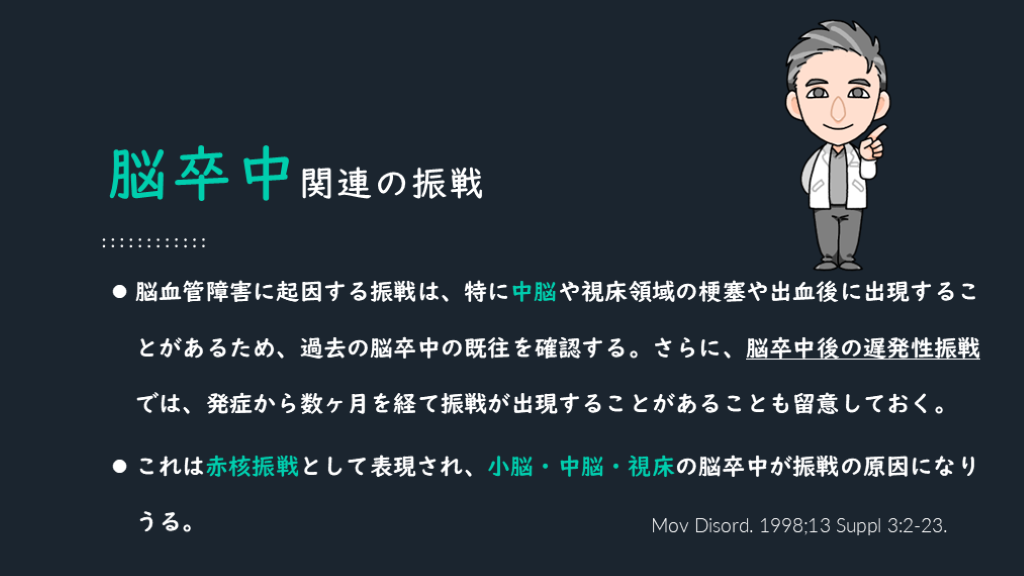 これは赤核振戦として表現され、小脳・中脳・視床の脳卒中が振戦の原因になりうる。 Mov Disord. 1998;13 Suppl 3:2-23.
