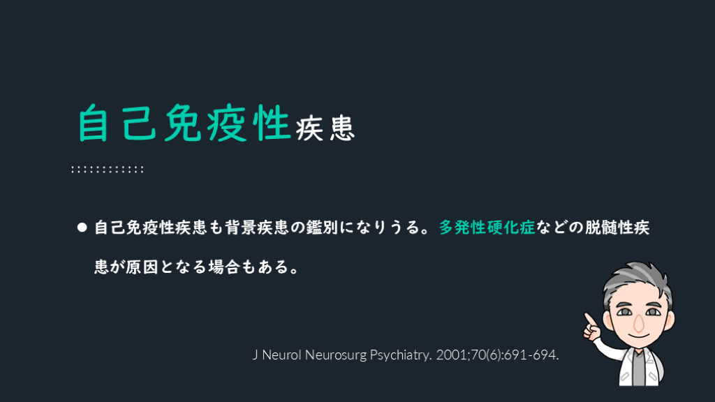 #37. 自己免疫性疾患 自己免疫性疾患も背景疾患の鑑別になりうる。多発性硬化症などの脱髄性疾患が原因となる場合もある。 J Neurol Neurosurg Psychiatry. 2001;70(6):691-694.