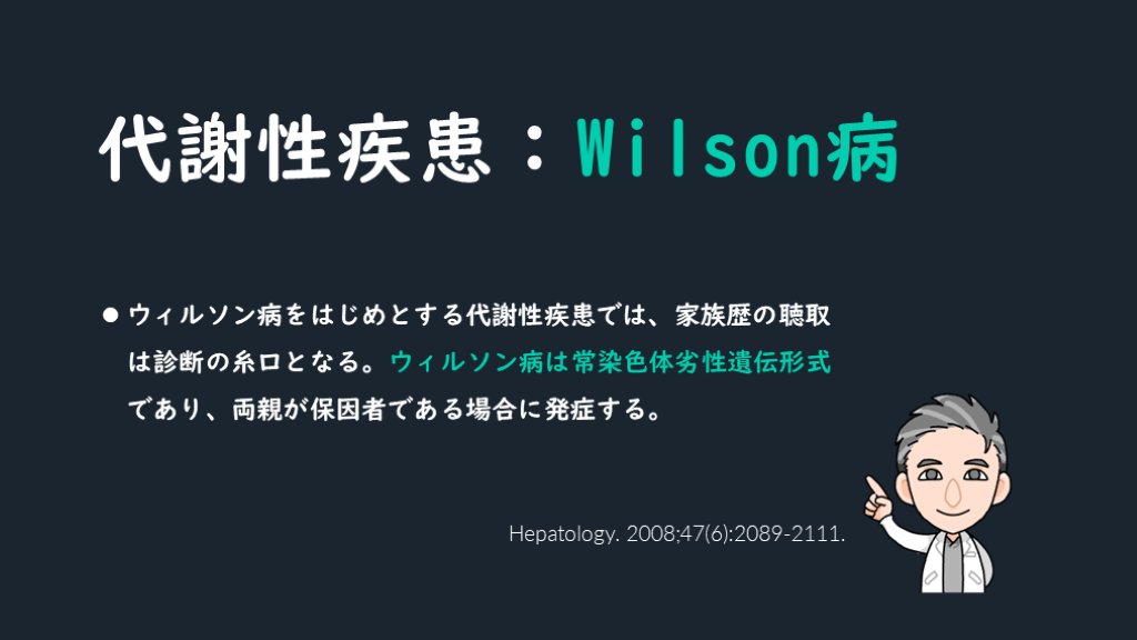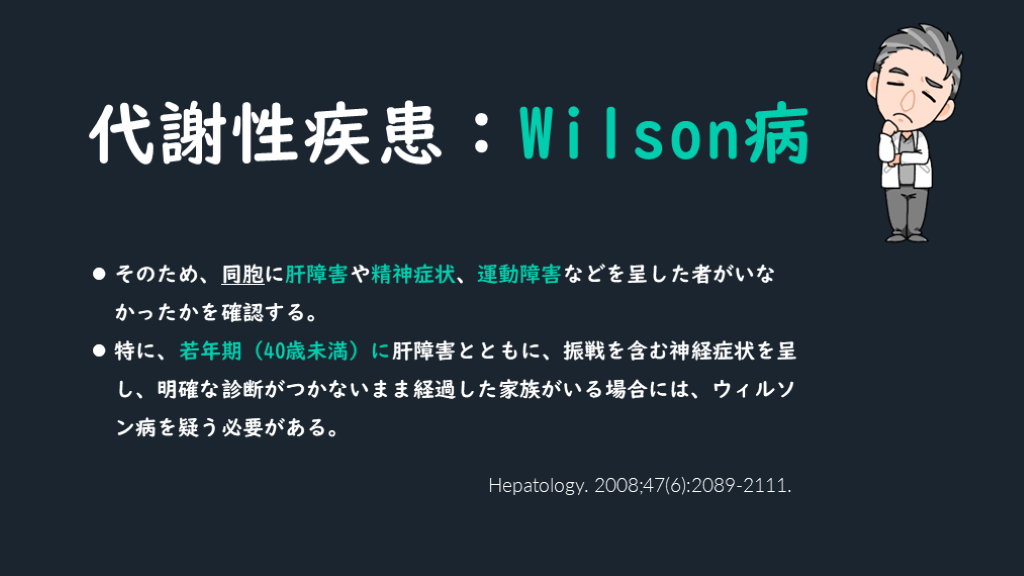 両手の振戦とともに四肢の筋張力低下、小刻み歩行様の歩行障害を認める。家族に同様の症状はいない。血液検査では軽度の肝機能障害があり。