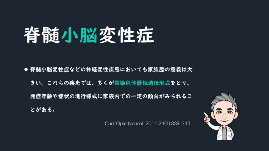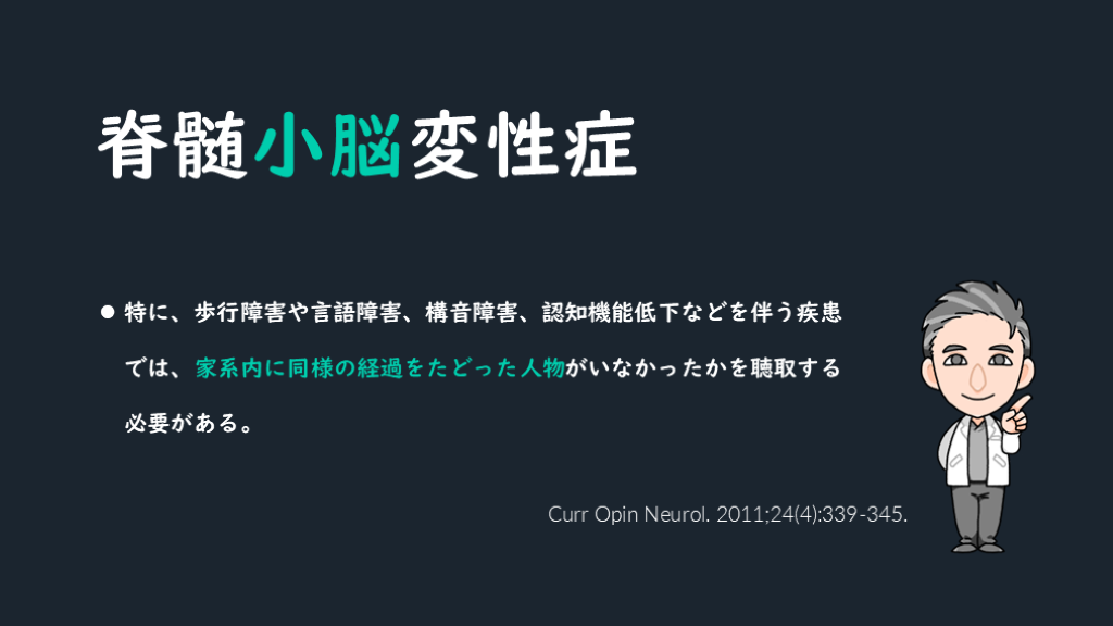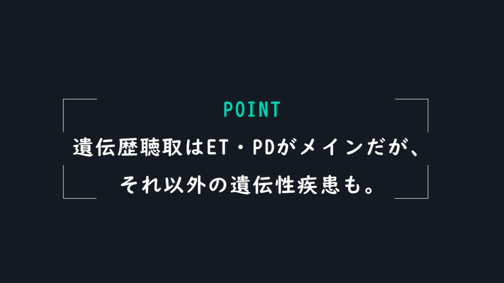 #35. 遺伝性疾患の病歴聴取 遺伝性疾患としては、若年発症のジストニア、ウィルソン病、脊髄小脳変性症などがある。これらを念頭に置いた場合、振戦に加えて歩行障害、構音障害、眼球運動障害など、他の神経所見の存在を確認する。