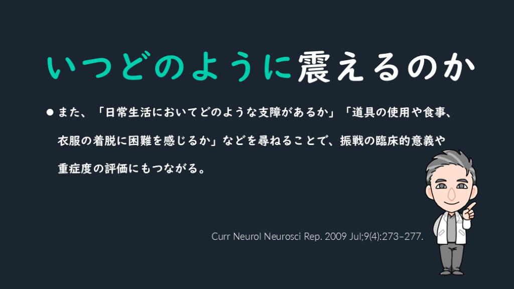 次に②神経学的診察では、振戦が出現する時相、左右差の有無、振戦の周波数や振幅、小脳症状や筋緊張といった随伴症状の有無を評価する。