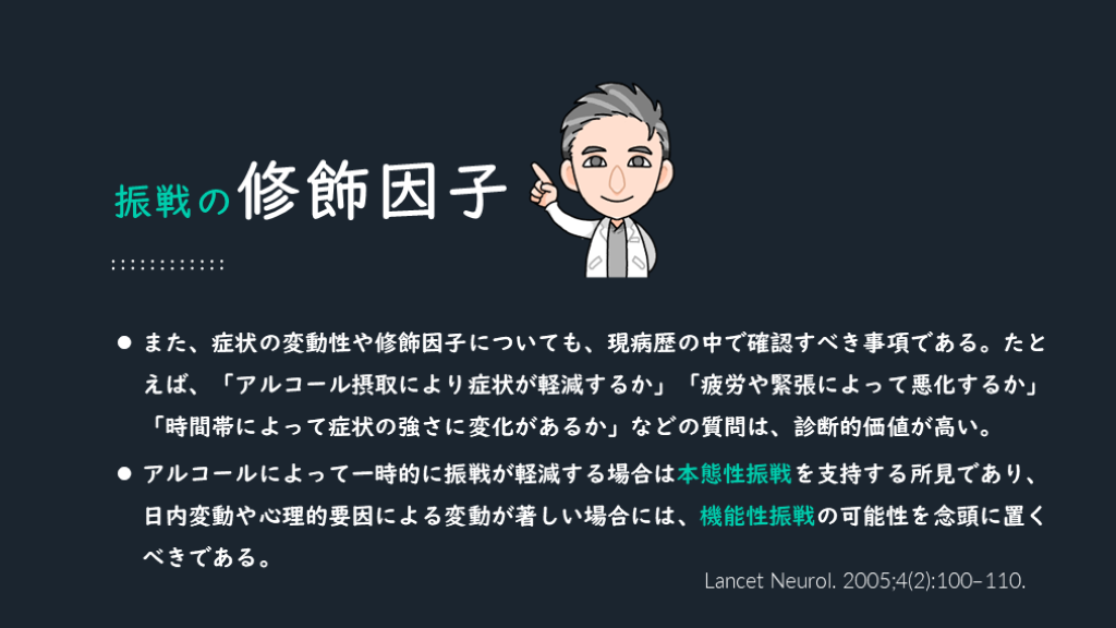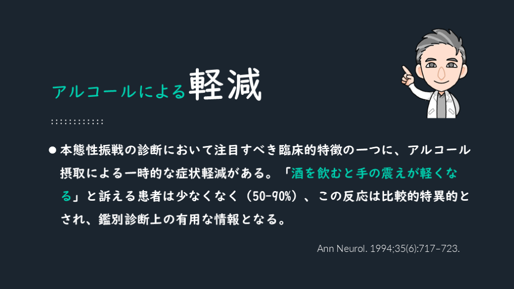 長年にわたり安定して経過している手の振戦が存在し、特に飲酒により改善する傾向がある場合には、本態性振戦の可能性が高まる。
