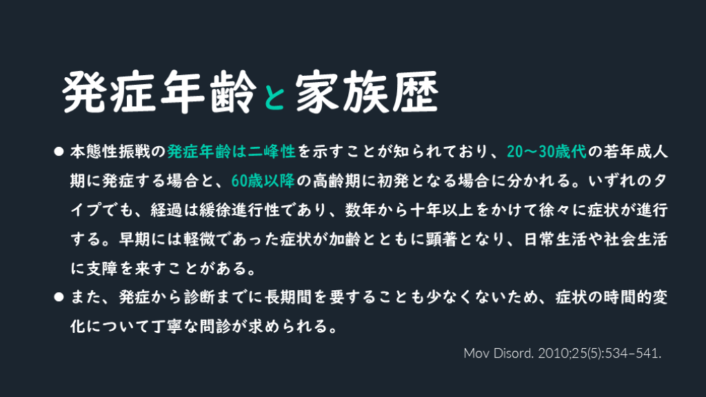 振戦が長年にわたり続いている(発症から長い経過年数がある)
