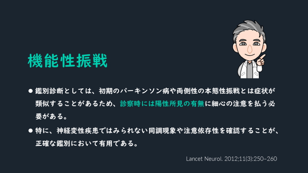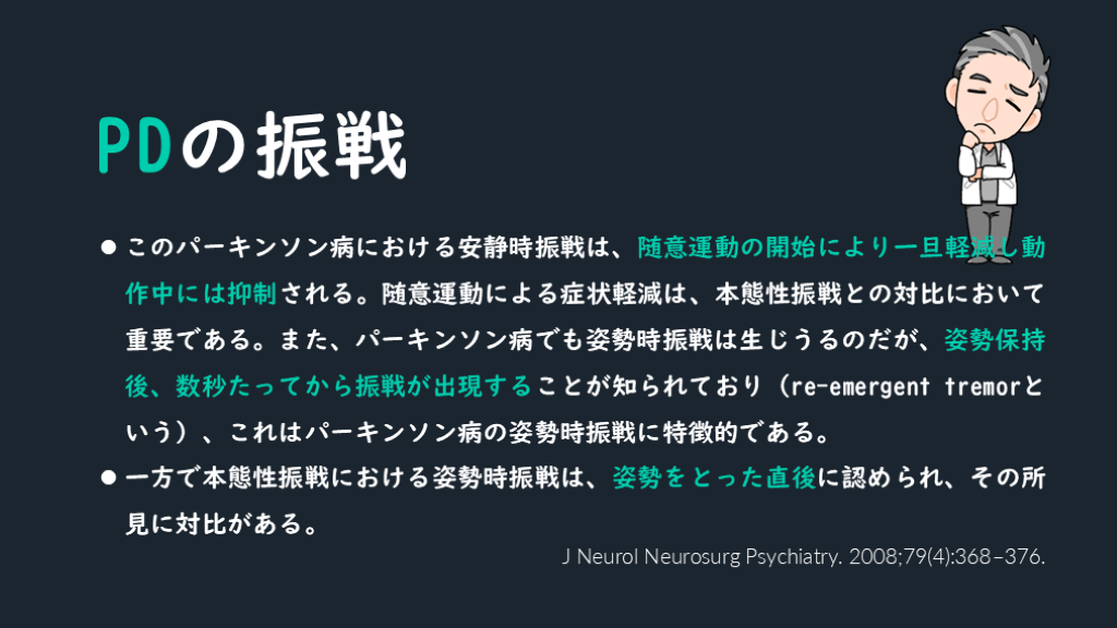 ただし、薬剤によってはパーキンソン病様の安静時振戦を呈することもある。