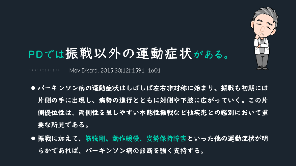 震え以外に、動きの遅さや歩きにくさなどの症状もある(他の運動症状も伴っている)