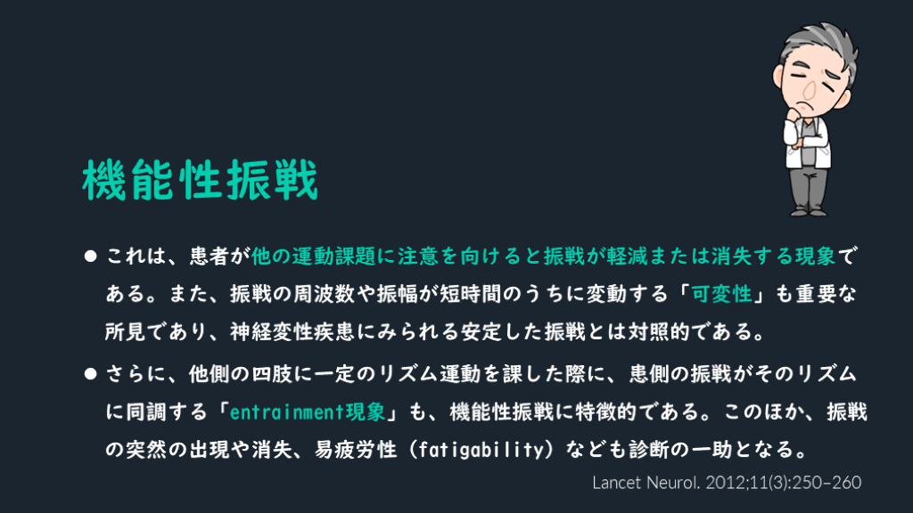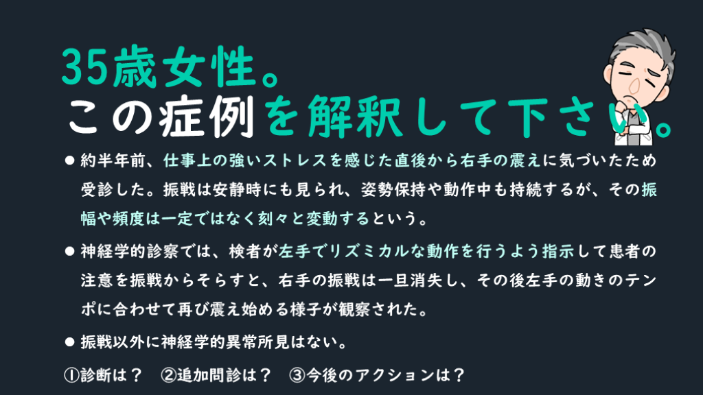 神経学的診察では、検者が左手でリズミカルな動作を行うよう指示して患者の注意を振戦からそらすと、右手の振戦は一旦消失し、その後左手の動きのテンポに合わせて再び震え始める様子が観察された。