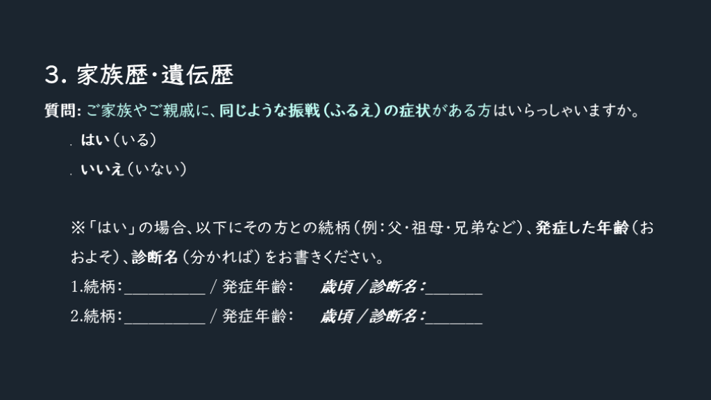 質問: 次の項目は、本態性振戦の可能性を示唆する所見です。当てはまるものにチェックしてください。