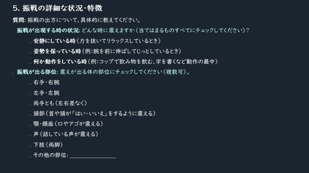 振戦が出る部位: 震えが出る体の部位にチェックしてください(複数可)。