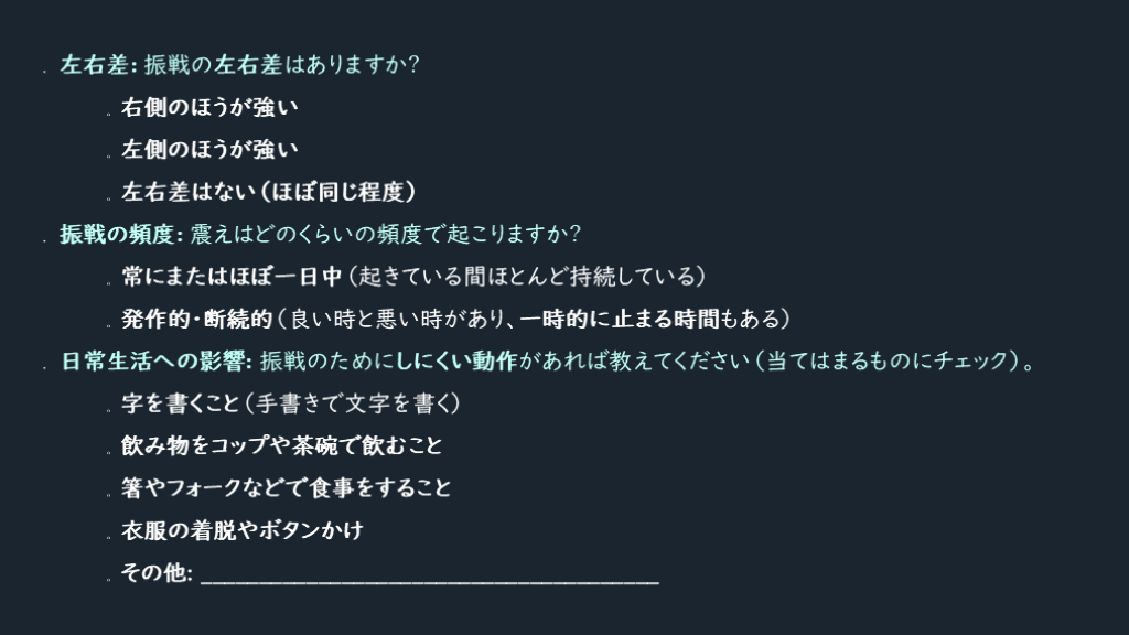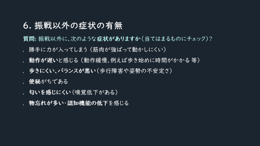 質問: 振戦以外に、次のような症状がありますか(当てはまるものにチェック)?