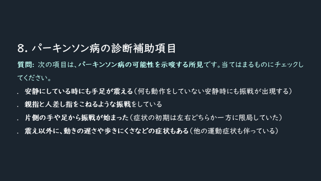 質問: 次の項目は、パーキンソン病の可能性を示唆する所見です。当てはまるものにチェックしてください。