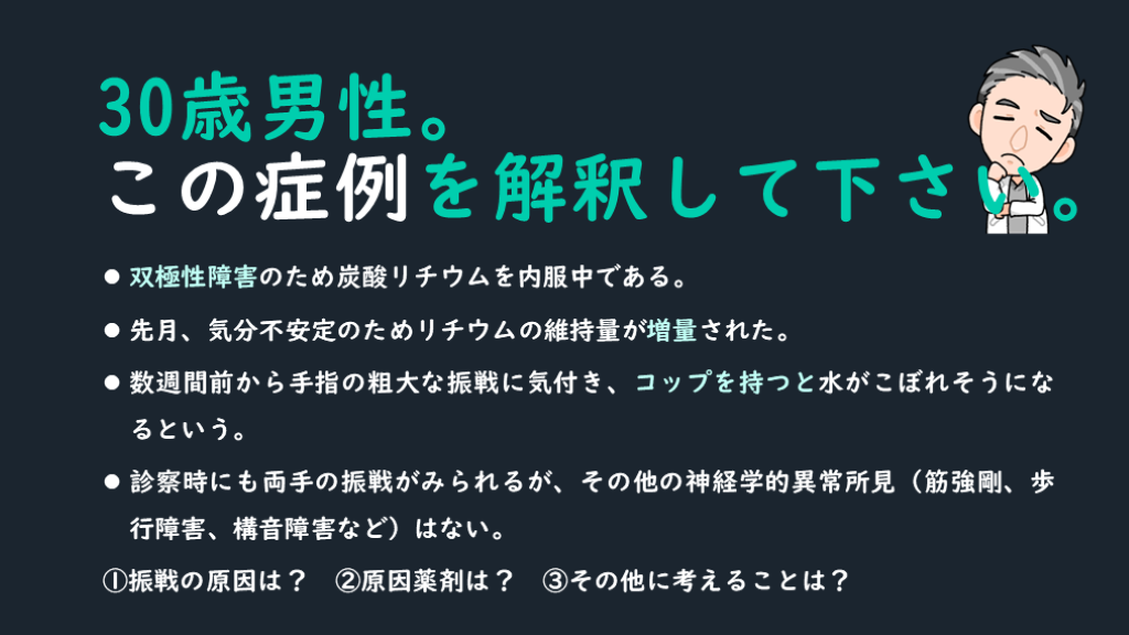 ①振戦の原因は? ②原因薬剤は? ③その他に考えることは? 30歳男性。