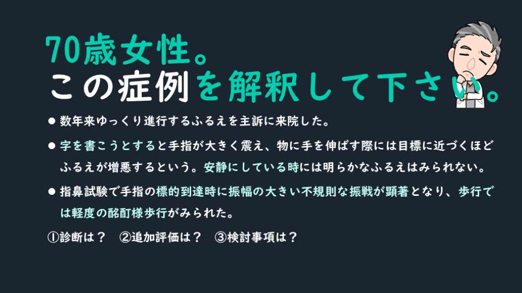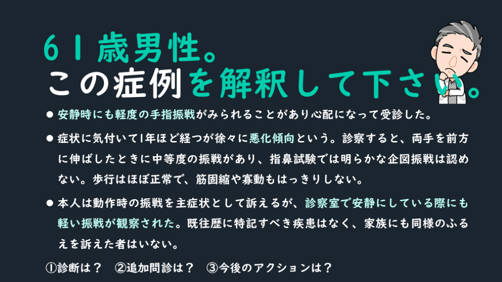 症状に気付いて1年ほど経つが徐々に悪化傾向という。診察すると、両手を前方に伸ばしたときに中等度の振戦があり、指鼻試験では明らかな企図振戦は認めない。歩行はほぼ正常で、筋固縮や寡動もはっきりしない。
