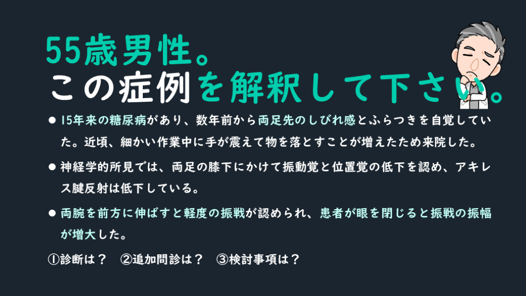 #119. 15年来の糖尿病があり、数年前から両足先のしびれ感とふらつきを自覚していた。近頃、細かい作業中に手が震えて物を落とすことが増えたため来院した。