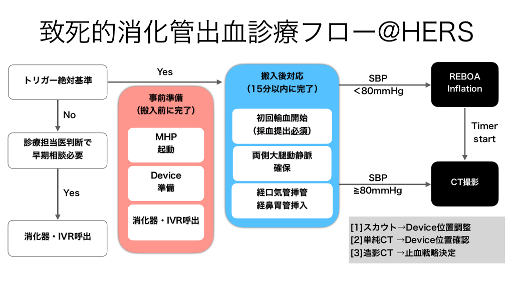 #10. 致死的消化管出血診療フロー@HERS トリガー絶対基準 No 診療担当医判断で 早期相談必要 Yes Yes 事前準備 (搬入前に完了) MHP 起動 Device 準備 消化器・IVR呼出 fl 消化器・IVR呼出 搬入後対応 (15分以内に完了) SBP <80mmHg REBOA In ation 初回輸血開始 (採血提出必須) Timer start 両側大腿動静脈 確保 経口気管挿管 経鼻胃管挿入 SBP 80mmHg CT撮影 [1]スカウト→Device位置調整 [2]単純CT →Device位置確認 [3]造影CT →止血戦略決定
