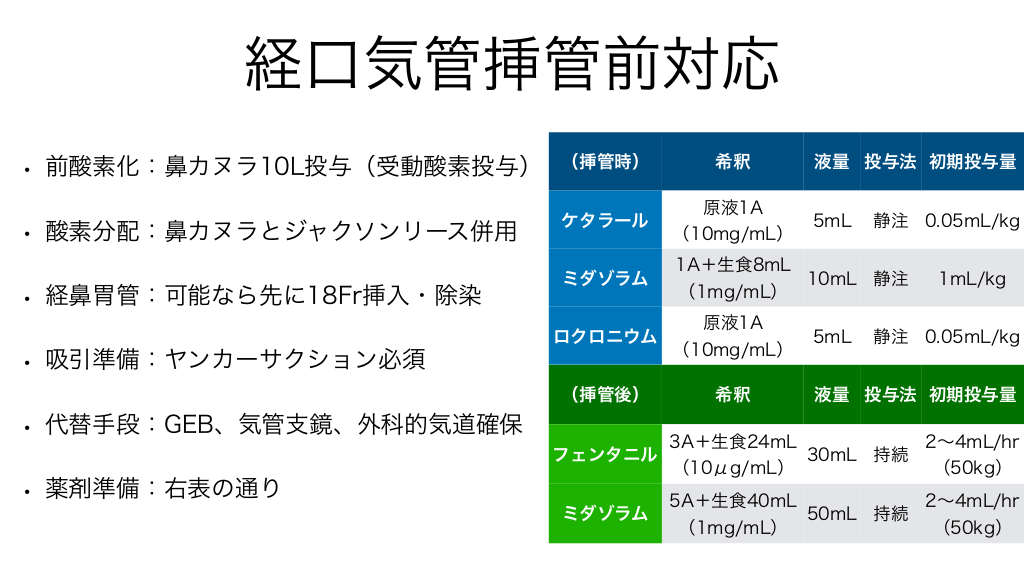 #11. 経口気管挿管前対応 • 前酸素化:鼻カヌラ10L投与(受動酸素投与) • 酸素分配:鼻カヌラとジャクソンリース併用 • 経鼻胃管:可能なら先に18Fr挿入・除染 (挿管時) ケタラール ミダゾラム ロクロニウム • 吸引準備:ヤンカーサクション必須 (挿管後) • 代替手段:GEB、気管支鏡、外科的気道確保 フェンタニル • 薬剤準備:右表の通り ミダゾラム 希釈 原液1A (10mg/mL) 1A+生食8mL (1mg/mL) 原液1A (10mg/mL) 希釈 3A+生食24mL (10μg/mL) 5A+生食40mL (1mg/mL) 液量 投与法 初期投与量 5mL 静注 0.05mL/kg 10mL 静注 5mL 1mL/kg 静注 0.05mL/kg 液量 投与法 初期投与量 30mL 持続 50mL 持続 2〜4mL/hr (50kg) 2〜4mL/hr (50kg)