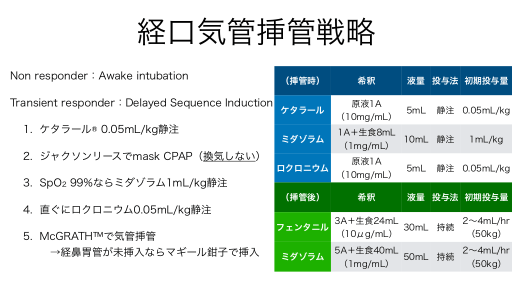 #12. 経口気管挿管戦略 Non responder:Awake intubation Transient responder:Delayed Sequence Induction (挿管時) ケタラール 1. ケタラール® 0.05mL/kg静注 ミダゾラム 2. ジャクソンリースでmask CPAP(換気しない) ロクロニウム 3. SpO2 99%ならミダゾラム1mL/kg静注 (挿管後) 希釈 原液1A (10mg/mL) 1A+生食8mL (1mg/mL) 原液1A (10mg/mL) 希釈 液量 投与法 初期投与量 5mL 静注 0.05mL/kg 10mL 静注 5mL 1mL/kg 静注 0.05mL/kg 液量 投与法 初期投与量 4. 直ぐにロクロニウム0.05mL/kg静注 5. McGRATH™で気管挿管 →経鼻胃管が未挿入ならマギール鉗子で挿入 フェンタニル ミダゾラム 3A+生食24mL (10μg/mL) 5A+生食40mL (1mg/mL) 30mL 持続 50mL 持続 2〜4mL/hr (50kg) 2〜4mL/hr (50kg)