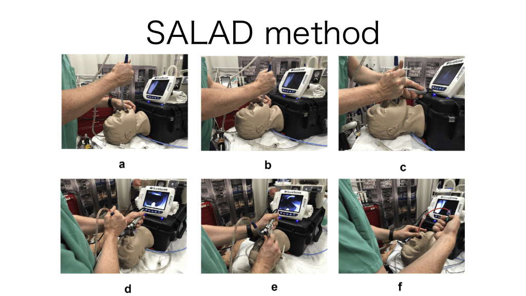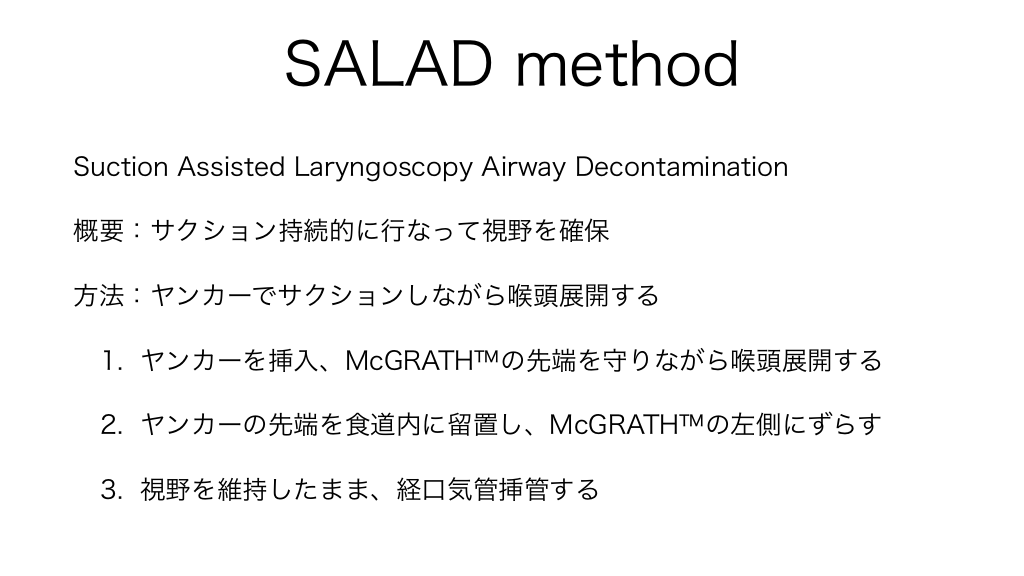#13. SALAD method Suction Assisted Laryngoscopy Airway Decontamination 概要:サクション持続的に行なって視野を確保 方法:ヤンカーでサクションしながら喉頭展開する 1. ヤンカーを挿入、McGRATH™の先端を守りながら喉頭展開する 2. ヤンカーの先端を食道内に留置し、McGRATH™の左側にずらす 3. 視野を維持したまま、経口気管挿管する