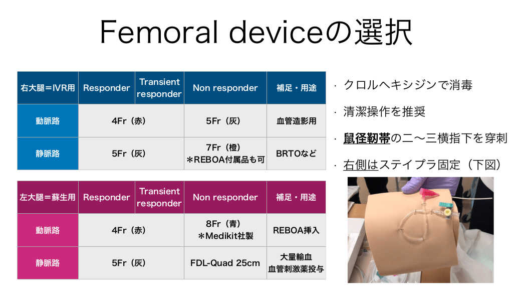 #15. Femoral deviceの選択 Transient 右大腿=IVR用 Responder responder 動脈路 静脈路 4Fr(赤) 5Fr(灰) Transient 左大腿=蘇生用 Responder responder 動脈路 静脈路 4Fr(赤) 5Fr(灰) Non responder 5Fr(灰) 補足・用途 • クロルヘキシジンで消毒 • 清潔操作を推奨 • 鼠径靭帯の二〜三横指下を穿刺 • 右側はステイプラ固定(下図) 血管造影用 7Fr(橙) *REBOA付属品も可 BRTOなど Non responder 補足・用途 8Fr(青) *Medikit社製 REBOA挿入 大量輸血 FDL-Quad 25cm 血管刺激薬投与