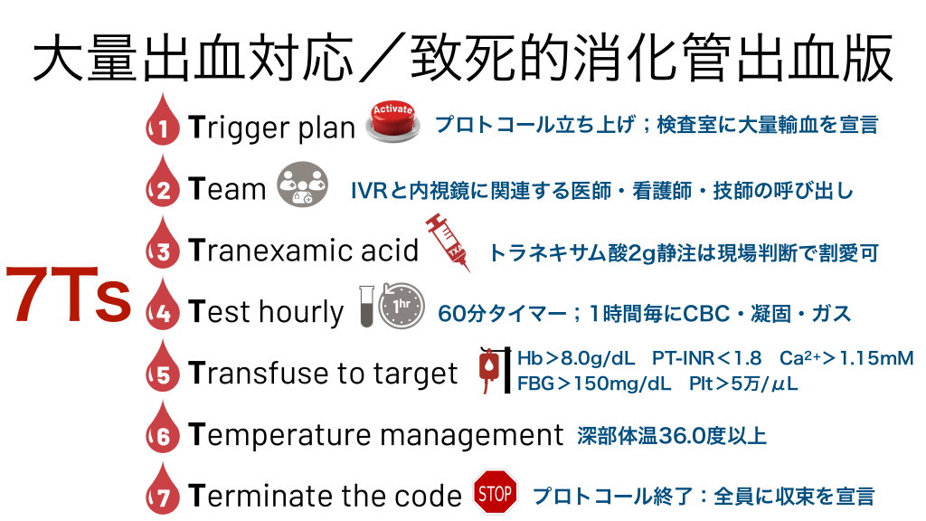 #17. 大量出血対応/致死的消化管出血版 プロトコール立ち上げ;検査室に大量輸血を宣言 IVRと内視鏡に関連する医師・看護師・技師の呼び出し 7Ts トラネキサム酸2g静注は現場判断で割愛可 60分タイマー;1時間毎にCBC・凝固・ガス Hb>8.0g/dL PT-INR<1.8 Ca2+>1.15mM FBG>150mg/dL Plt>5万/μL 深部体温36.0度以上 プロトコール終了:全員に収束を宣言