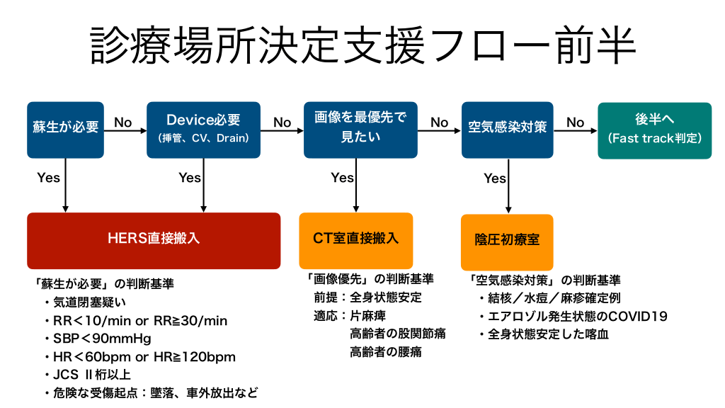 #2. 診療場所決定支援フロー前半 蘇生が必要 Yes No Device必要 (挿管、CV、Drain) Yes HERS直接搬入 「蘇生が必要」の判断基準 ・気道閉塞疑い ・RR<10/min or RR 30/min ・SBP<90mmHg ・HR<60bpm or HR 120bpm ・JCS Ⅱ桁以上 ・危険な受傷起点:墜落、車外放出など No 画像を最優先で No 見たい Yes CT室直接搬入 「画像優先」の判断基準 前提:全身状態安定 適応:片麻痺 高齢者の股関節痛 高齢者の腰痛 空気感染対策 後半へ No (Fast track判定) Yes 陰圧初療室 「空気感染対策」の判断基準 ・結核/水痘/麻疹確定例 ・エアロゾル発生状態のCOVID19 ・全身状態安定した喀血