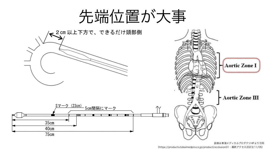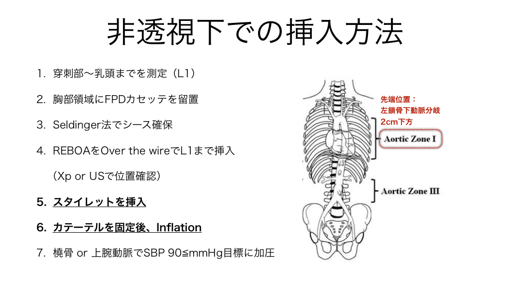 #21. 非透視下での挿入方法 1. 穿刺部〜乳頭までを測定(L1) 2. 胸部領域にFPDカセッテを留置 3. Seldinger法でシース確保 4. REBOAをOver the wireでL1まで挿入 (Xp or USで位置確認) 5. スタイレットを挿入 6. カテーテルを固定後、In ation fl 7. 橈骨 or 上腕動脈でSBP 90 mmHg目標に加圧 先端位置: 左鎖骨下動脈分岐 2cm下方