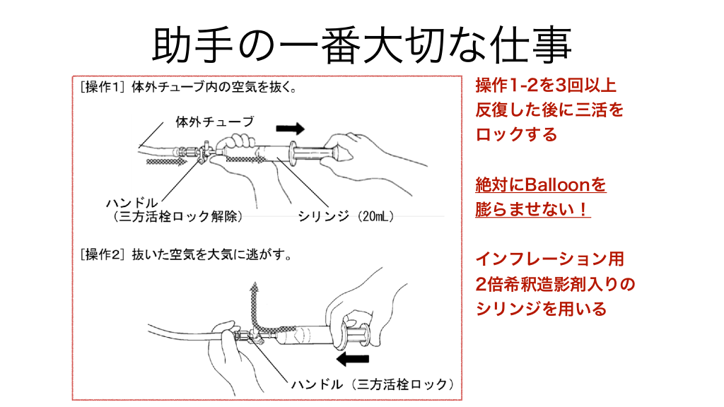 #22. 助手の一番大切な仕事 操作1-2を3回以上 反復した後に三活を ロックする 絶対にBalloonを 膨らませない! インフレーション用 2倍希釈造影剤入りの シリンジを用いる