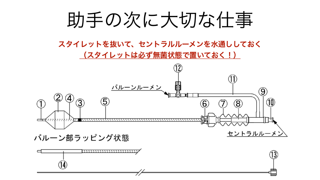 #23. 助手の次に大切な仕事 スタイレットを抜いて、セントラルルーメンを水通ししておく (スタイレットは必ず無菌状態で置いておく!)