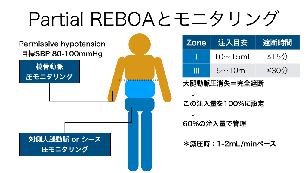 #29. Partial REBOAとモニタリング Permissive hypotension 目標SBP 80-100mmHg 橈骨動脈 圧モニタリング 対側大腿動脈 or シース 圧モニタリング Zone 注入目安 遮断時間 Ⅰ 10〜15mL 15分 Ⅲ 5〜10mL 30分 大腿動脈圧消失=完全遮断 ↓ この注入量を100%に設定 ↓ 60%の注入量で管理 *減圧時:1-2mL/minペース