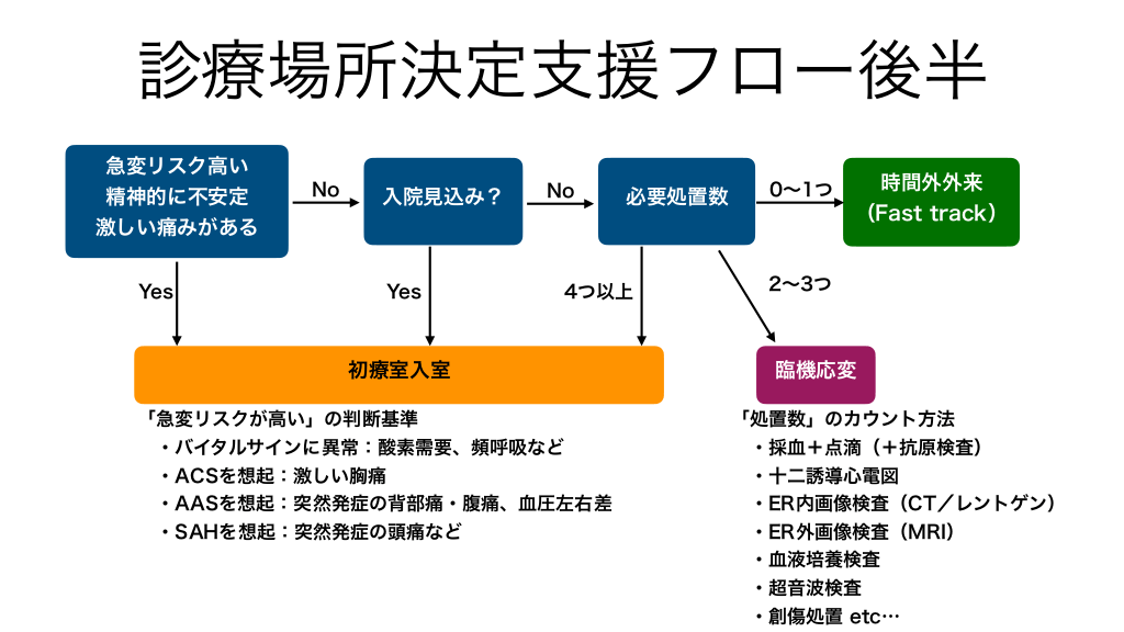 #3. 診療場所決定支援フロー後半 急変リスク高い 精神的に不安定 No 入院見込み? No 必要処置数 (Fast track) 激しい痛みがある Yes Yes 4つ以上 初療室入室 「急変リスクが高い」の判断基準 ・バイタルサインに異常:酸素需要、頻呼吸など ・ACSを想起:激しい胸痛 ・AASを想起:突然発症の背部痛・腹痛、血圧左右差 ・SAHを想起:突然発症の頭痛など 時間外外来 0〜1つ 2〜3つ 臨機応変 「処置数」のカウント方法 ・採血+点滴(+抗原検査) ・十二誘導心電図 ・ER内画像検査(CT/レントゲン) ・ER外画像検査(MRI) ・血液培養検査 ・超音波検査 ・創傷処置 etc…
