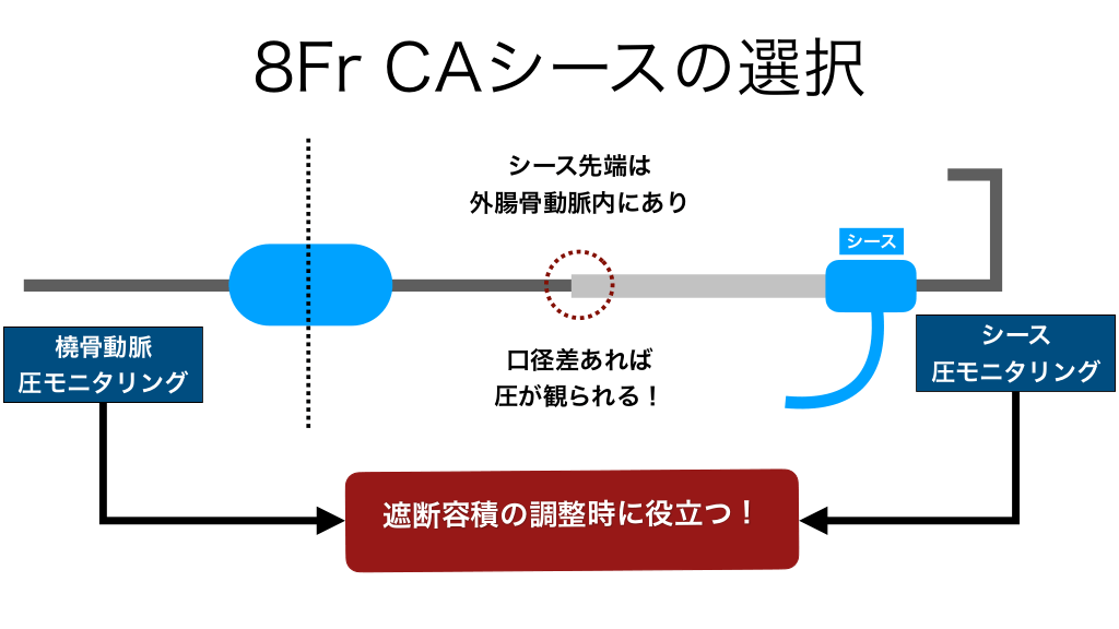 #30. 8Fr CAシースの選択 シース先端は 外腸骨動脈内にあり シース 橈骨動脈 圧モニタリング 口径差あれば 圧が観られる! 遮断容積の調整時に役立つ! シース 圧モニタリング