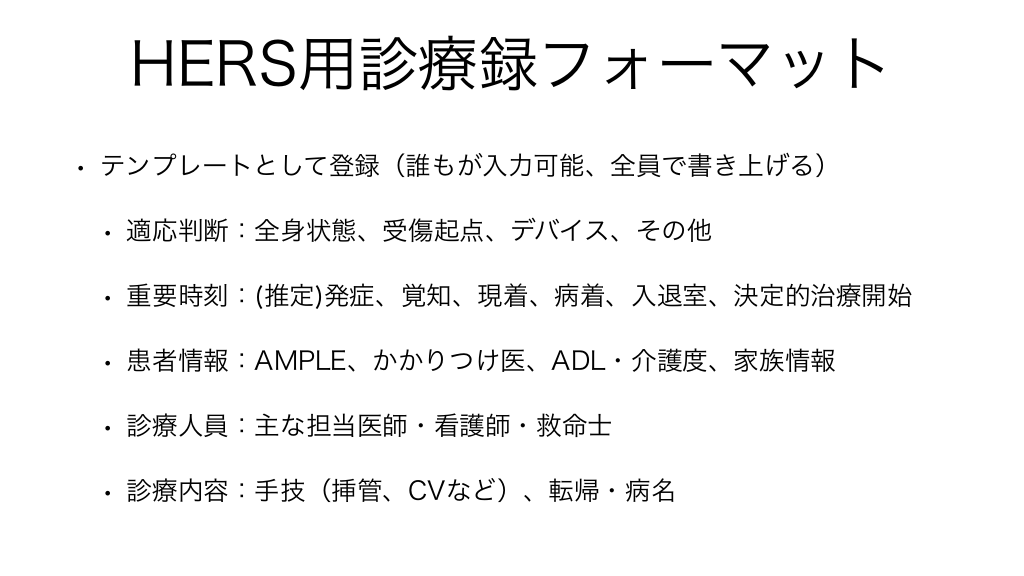 #32. HERS用診療録フォーマット • テンプレートとして登録(誰もが入力可能、全員で書き上げる) • 適応判断:全身状態、受傷起点、デバイス、その他 • 重要時刻:(推定)発症、覚知、現着、病着、入退室、決定的治療開始 • 患者情報:AMPLE、かかりつけ医、ADL・介護度、家族情報 • 診療人員:主な担当医師・看護師・救命士 • 診療内容:手技(挿管、CVなど)、転帰・病名