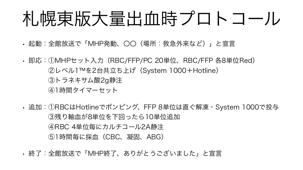 #33. 札幌東版大量出血時プロトコール • 起動:全館放送で「MHP発動、〇〇(場所:救急外来など)」と宣言 • 即応:①MHPセット入力(RBC/FFP/PC 20単位、RBC/FFP 各8単位Red) ②レベル1™を2台共立ち上げ(System 1000+Hotline) ③トラネキサム酸2g静注 ④1時間タイマーセット • 追加:①RBCはHotlineでポンピング、FFP 8単位は直ぐ解凍・System 1000で投与 ③残り輸血が8単位を下回ったら10単位追加 ④RBC 4単位毎にカルチコール2A静注 ⑤1時間毎に採血(CBC、凝固、ABG) • 終了:全館放送で「MHP終了、ありがとうございました」と宣言