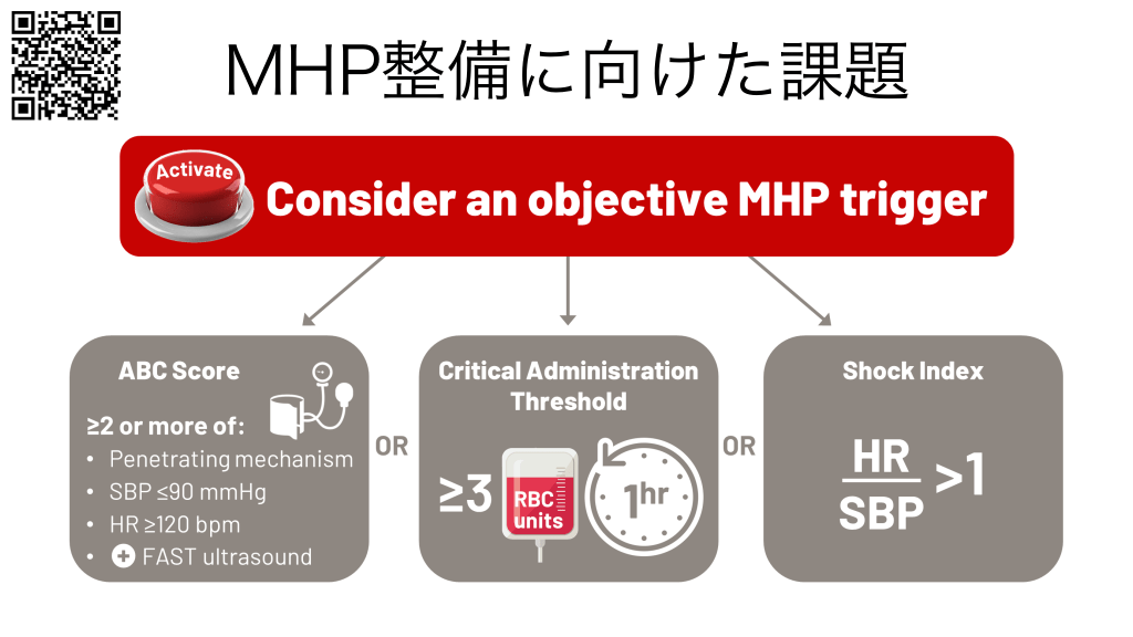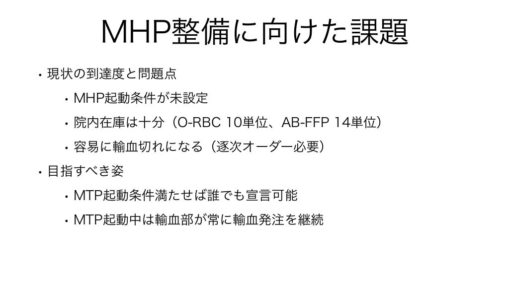 #34. MHP整備に向けた課題 • 現状の到達度と問題点 • MHP起動条件が未設定 • 院内在庫は十分(O-RBC 10単位、AB-FFP 14単位) • 容易に輸血切れになる(逐次オーダー必要) • 目指すべき姿 • MTP起動条件満たせば誰でも宣言可能 • MTP起動中は輸血部が常に輸血発注を継続