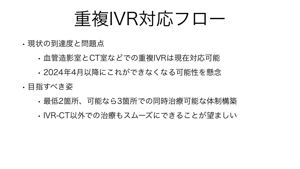 #36. 重複IVR対応フロー • 現状の到達度と問題点 • 血管造影室とCT室などでの重複IVRは現在対応可能 • 2024年4月以降にこれができなくなる可能性を懸念 • 目指すべき姿 • 最低2箇所、可能なら3箇所での同時治療可能な体制構築 • IVR-CT以外での治療もスムーズにできることが望ましい