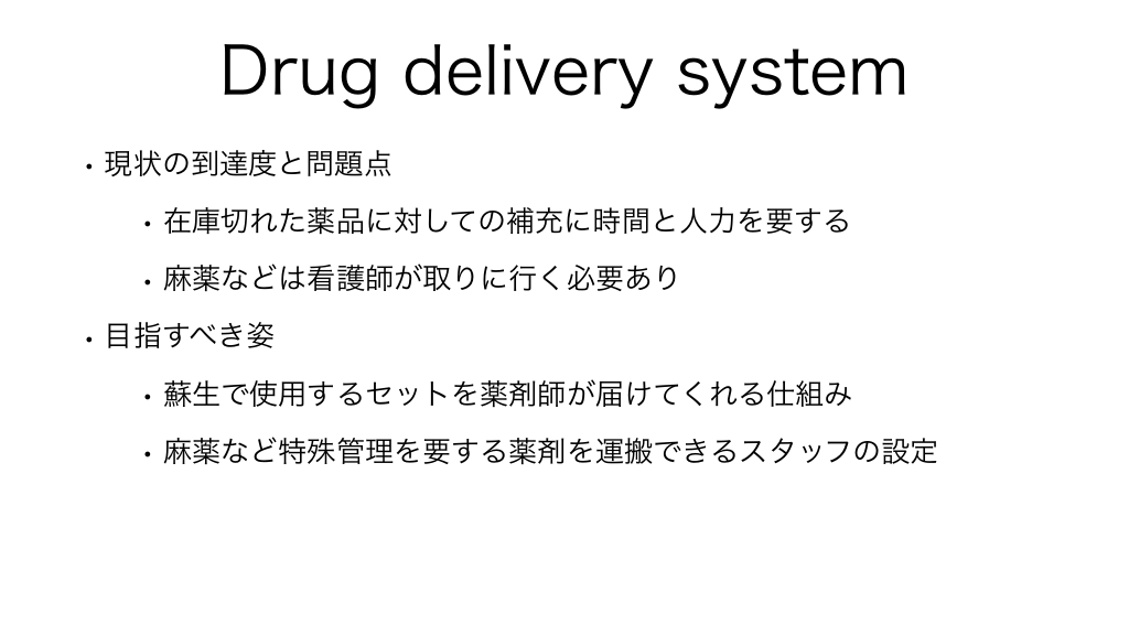 #37. Drug delivery system • 現状の到達度と問題点 • 在庫切れた薬品に対しての補充に時間と人力を要する • 麻薬などは看護師が取りに行く必要あり • 目指すべき姿 • 蘇生で使用するセットを薬剤師が届けてくれる仕組み • 麻薬など特殊管理を要する薬剤を運搬できるスタッフの設定