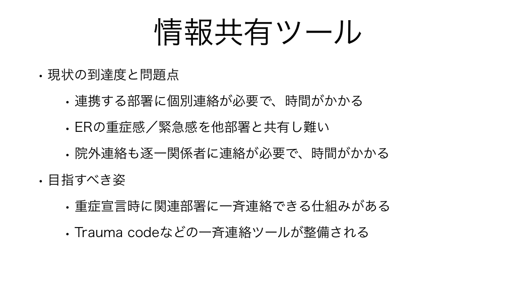 #38. 情報共有ツール • 現状の到達度と問題点 • 連携する部署に個別連絡が必要で、時間がかかる • ERの重症感/緊急感を他部署と共有し難い • 院外連絡も逐一関係者に連絡が必要で、時間がかかる • 目指すべき姿 • 重症宣言時に関連部署に一斉連絡できる仕組みがある • Trauma codeなどの一斉連絡ツールが整備される